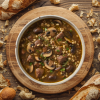 Beef, mushroom and vegetable broth with barley seasoned with Worcester sauce