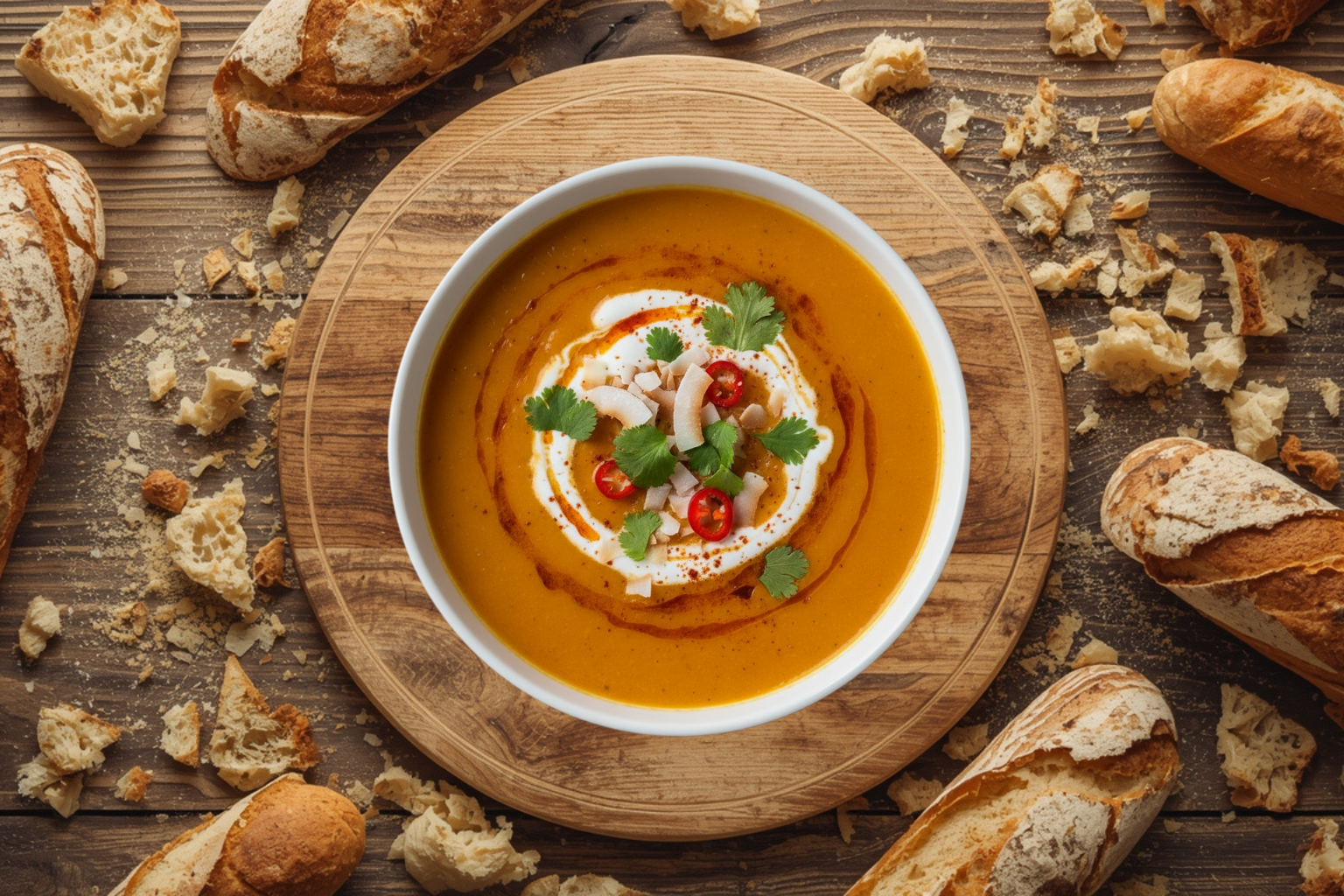 Carrot, lentil and coconut soup with orange, ginger, garlic and chilli