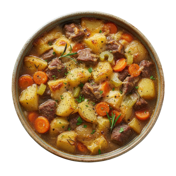 A hearty, savoury meal with tender beef and soft potatoes baked in a rich sauce.