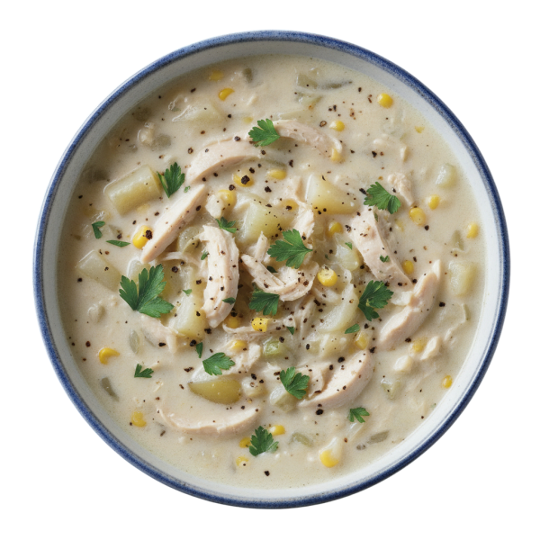 A rich, creamy, chowder with chicken, vegetables, white wine, garlic, herbs and spices