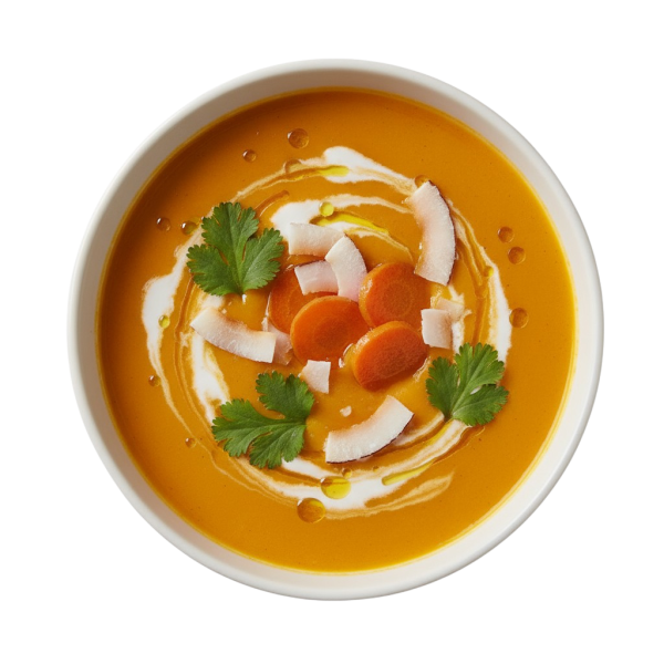 Smooth carrot and coconut soup with butter, ginger and citrus