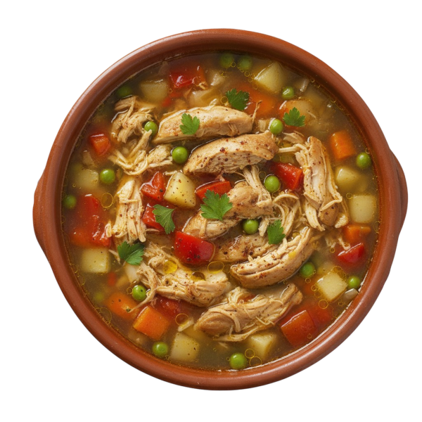 Chicken chunks, tomatoes, roasted peppers, lentils, garlic, herbs, with Smokey paprika notes.