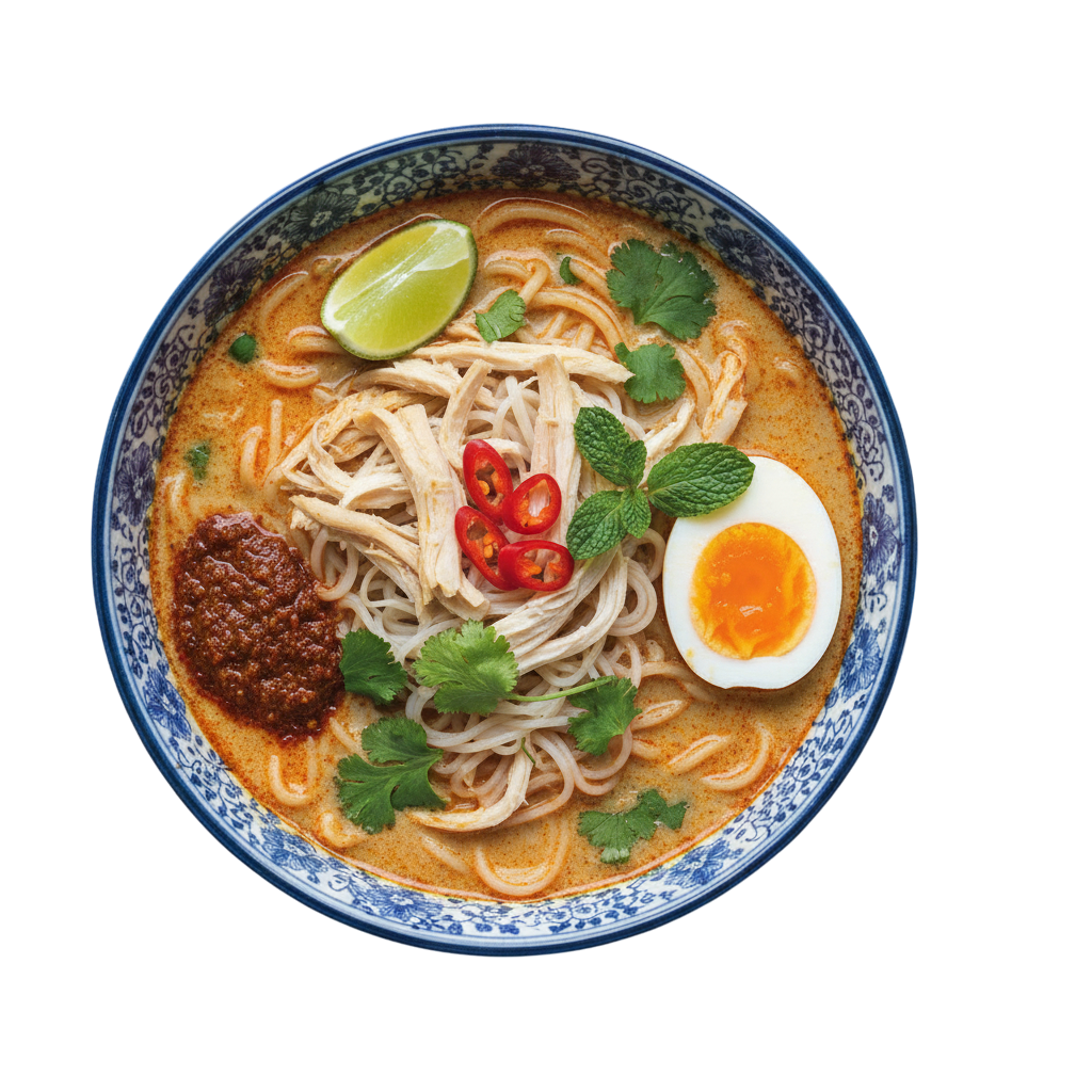 A spicy, fragrant Southeast Asian coconut curry noodle soup with tender chicken and complex flavours.