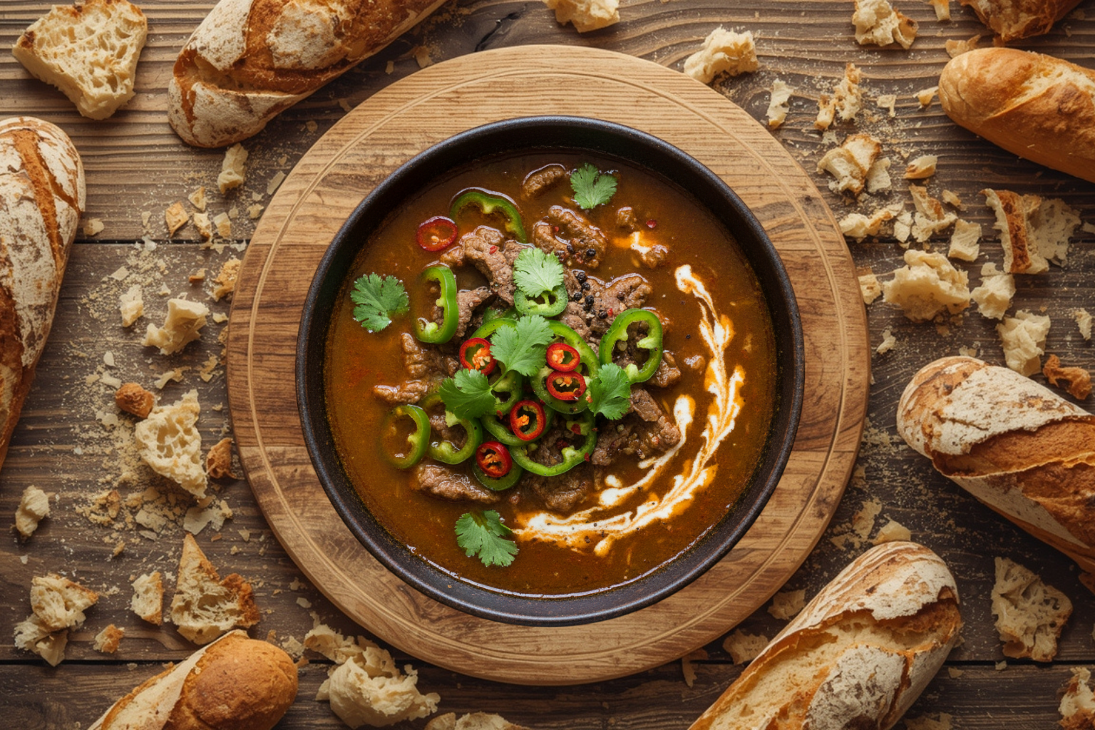 A savoury-spicy soup blending rich beef and zesty green pepper for a fiery, comforting kick.