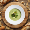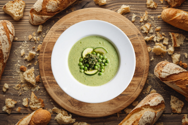 A creamy, vibrant green soup bursting with fresh, summery flavours of courgette and sweet peas.