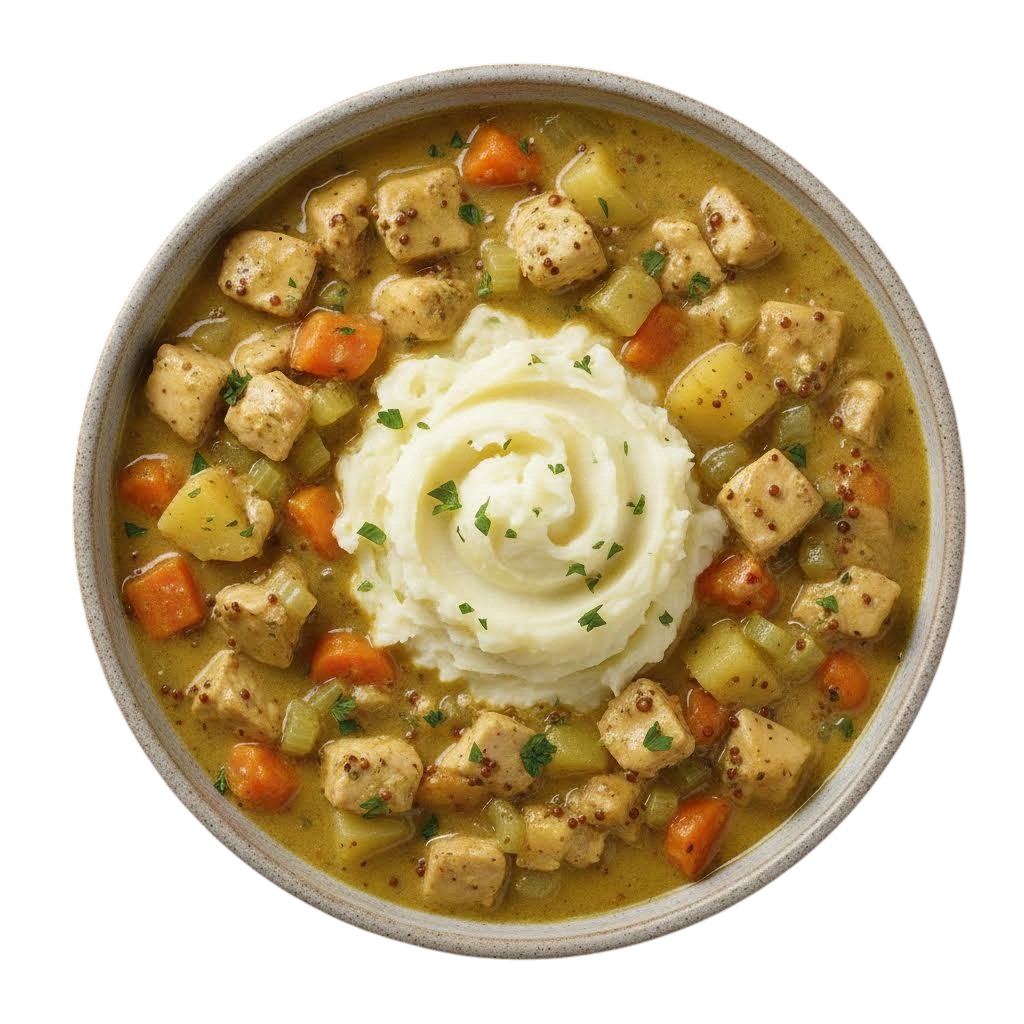 A hearty French stew with tender chicken in a tangy, creamy Dijon mustard sauce.