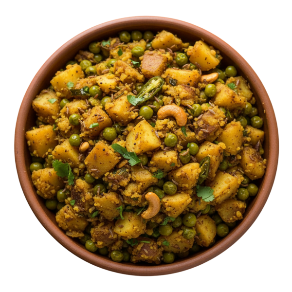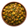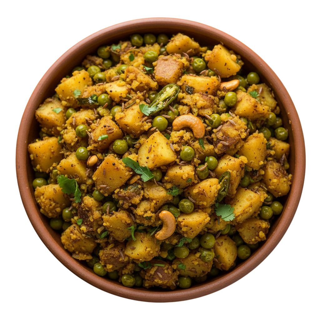 A flavourful explosion of spiced potato, peas, and aromatics.