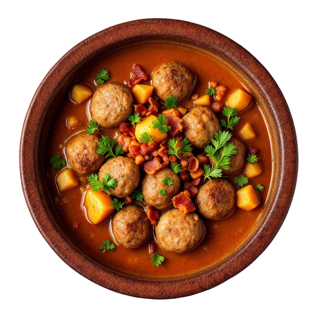 Meatballs Origin EU [Meat 60% (Pork 47%, Beef 13%), Onion, Potato, Potato Starch, Potato Flakes, Salt, Potato Fibres, Sugar, Dextrose, Beef Stock, Natural Aroma, Spice Extract. Fried in Rapeseed Oil] (42%), Tomato [Diced Tomatoes, Tomato Juice, Citric Acid (E330)], Water, Tomato Paste, Bacon [Xxxxxxxxxxxx] (3%), Rapeseed Oil, Onion, Pepper Green, Garlic Puree, Demerara Sugar, Dark Balsamic Vinegar [Wine Vinegar (#SULPHITES#), Concentrated Grape Must (#SULPHITES#), Colour ((#SULPHITES#) Ammonia Caramel), Antioxidant (#SULPHUR DIOXIDE#)], Vegetable Bouillon[Salt, Dried Glucose Syrup, Maltodextrin, Yeast Extract, Sugar, Natural Flavouring, Dried Carrot, Tomato Powder, Onion Powder, Celery Powder(#CERERY#), Herbs (Bay), Garlic Powder, Spices (Black Pepper)], Smoked Paprika, Chilli Red, Salt, Black Pepper Ground.