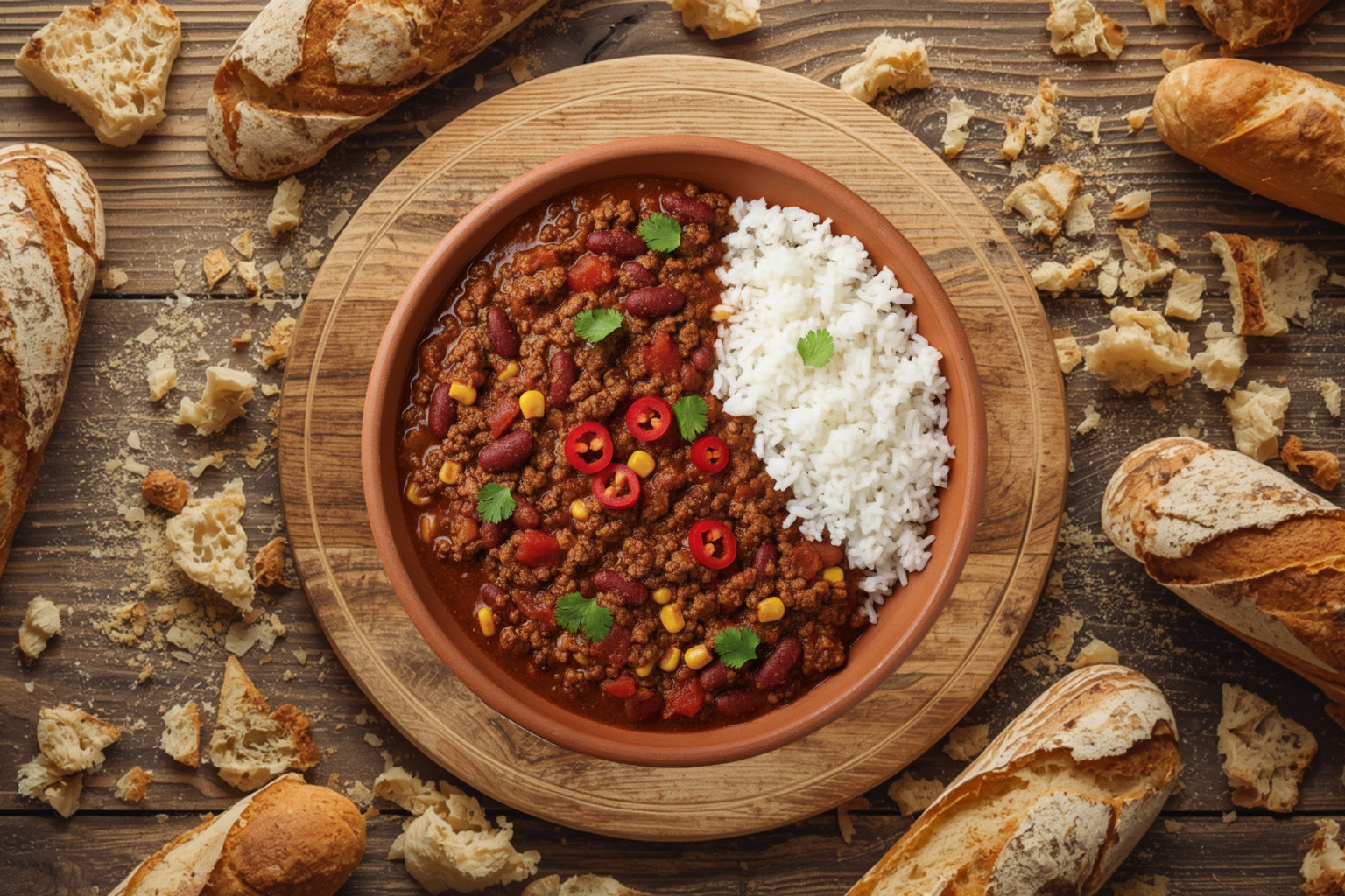 Spicy Chilli con Carne with minced beef, tomato, beans and peppers with chilli, chocolate and lime.