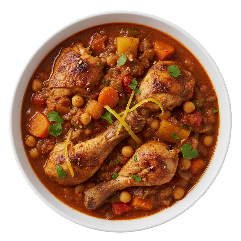 Aromatic chicken simmered with spices, olives, and citrus for a fragrant, flavorful meal.