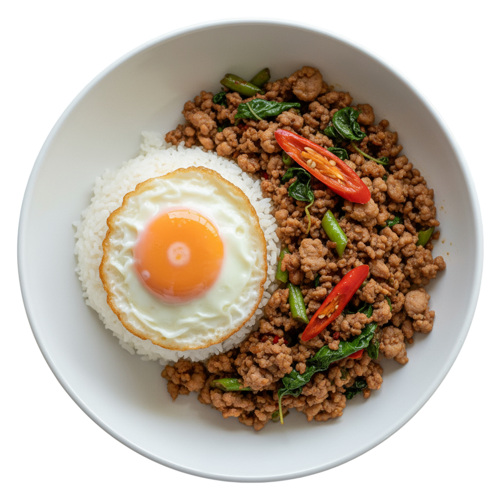 An explosive stir-fry of minced Pork chilli peppers and green beans. A spicy Thai street food classic.