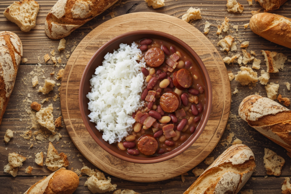 A one-pot breakfast featuring sausages, bacon, beans, mushroom in sweet, spicy tomato sauce