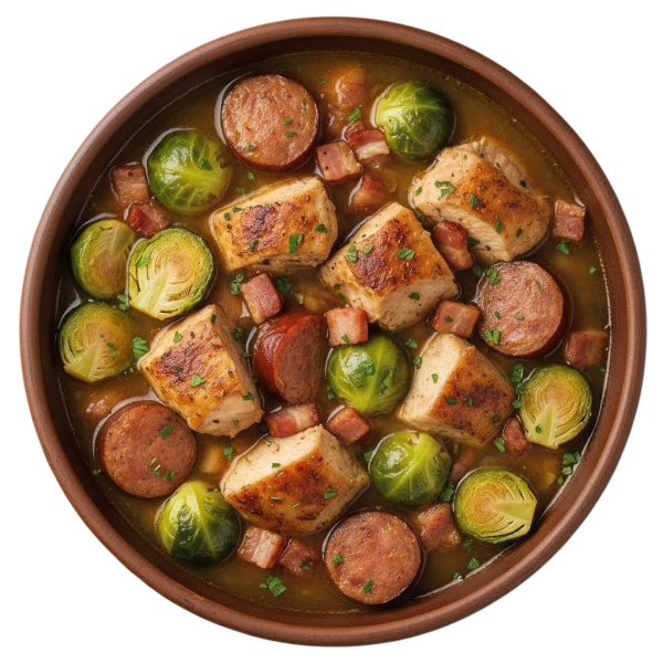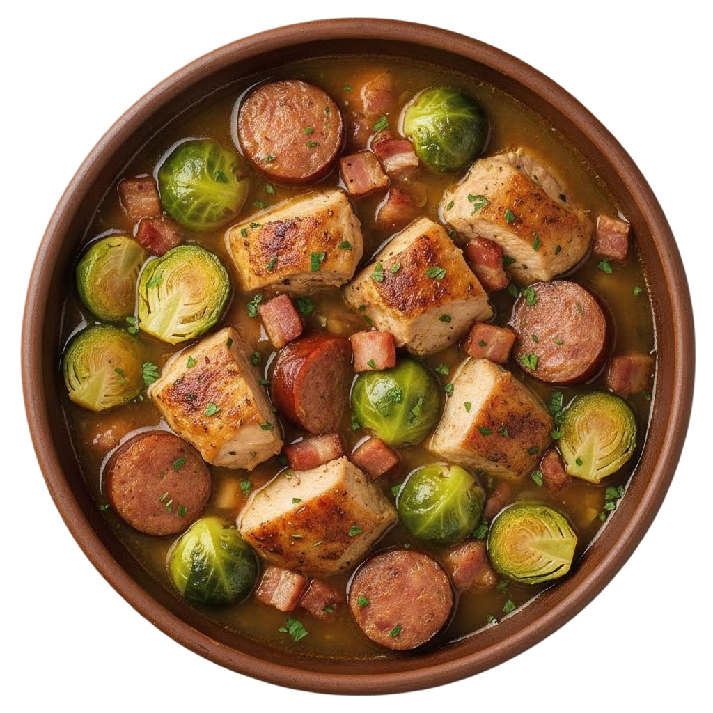 A smokey, savoury, and hearty stew with rich meats and earthy sprouts.