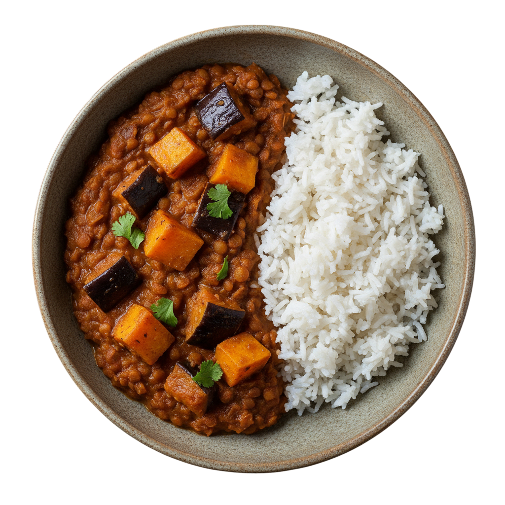 A comforting lentil stew with aubergine & butternut squash, simmered in a spiced coconut sauce.
