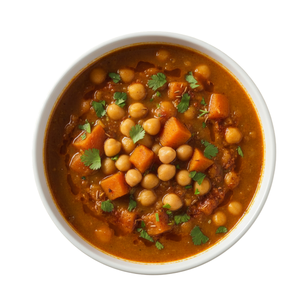 A vibrant, spiced blend of sweet potato and chickpea with a creamy, Moroccan twist.
