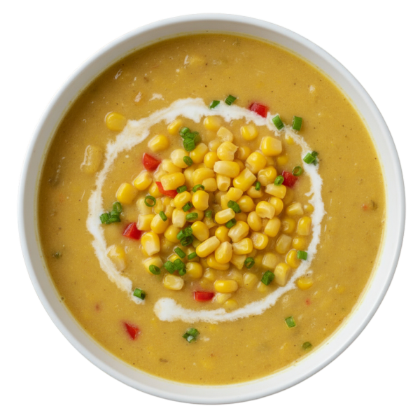 A vibrant, creamy bowl of sweet corn and potatoes with smokey-sweet undertones.