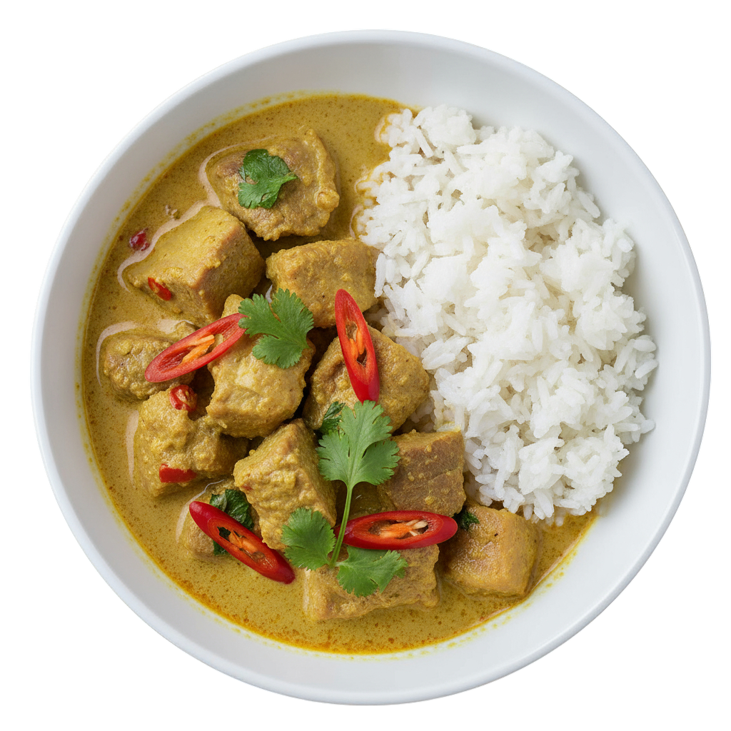 A mellow, turmeric-infused pork curry in a sweet and fragrant coconut sauce.